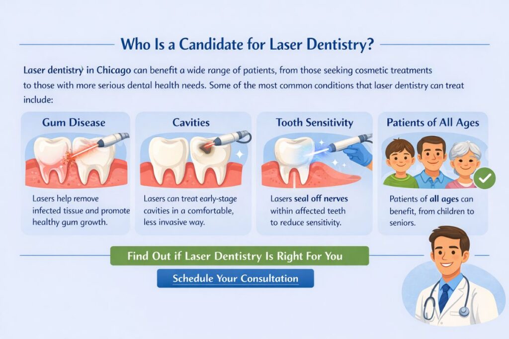 Laser dentistry in Chicago can benefit a wide range of patients, from those seeking cosmetic treatments to those with more serious dental health needs. Some of the most common conditions that laser dentistry can treat include: